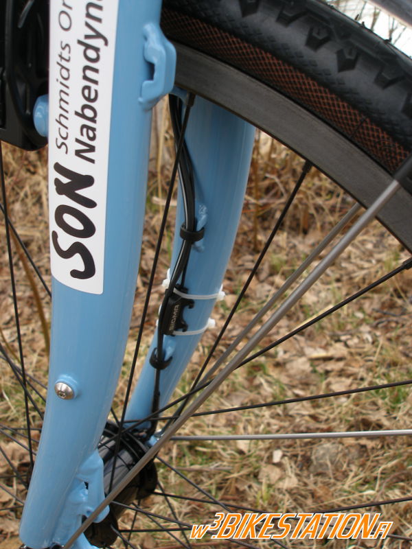 Dieses Fahrrad ist ein "Neubau". Vorab wählte er eine Farbe für Rahmen und Gabel. Er wollte eine wenig attraktive Farbe. Er hatte auch die Hoffnung, dass während seiner Reisen die Oberfläche den Schmutz anhaften lassen wird, damit unterwegs evtl. Diebe erst gar nicht auf das Rad aufmerksam werden. Seine Wahl fiel auf RAL 5024 Pastellblau mit weissem Dekor.
