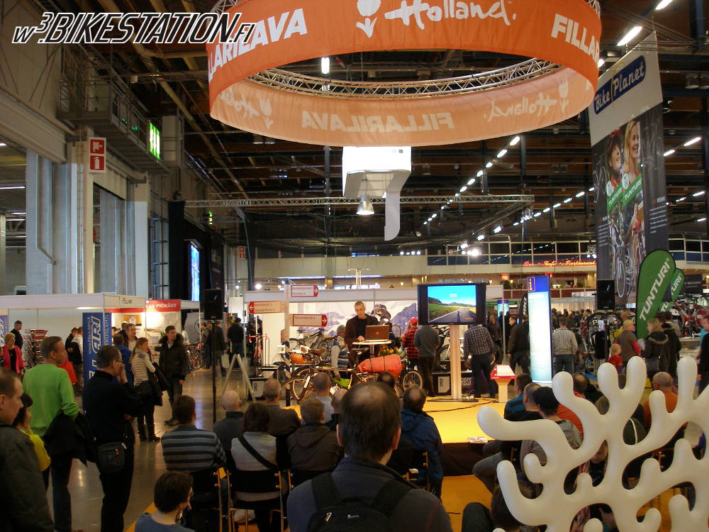 ImageDescriptionPicture created by AWIDON Finland wwwawidonfi for Bike Station Finland wwwbikestationfi Motiv: Heikki Siivari on GoExpo Bike Show 2013 presenting his bicycle through Europe tour 2012 In the picture: visitors monitor stage Tunturi Rose Holland Fillarilava Fillari lehti